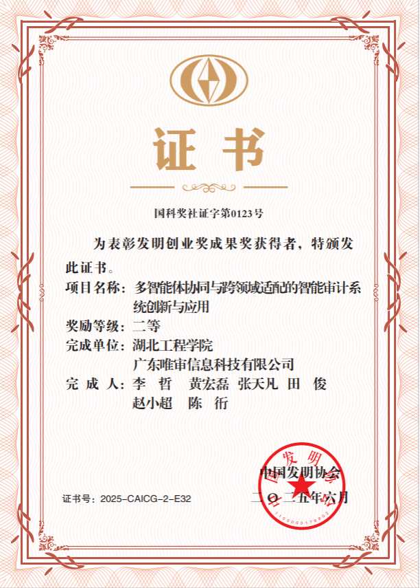 近日,中国发明协会颁发了2025年度发明创业奖证书,我校作为第一完成单位,我院李哲教授作为第一完成人的《多智能体协同与跨领域适配的智能审计系统创新与应用》成果荣获中国发明协会发明创业奖成果奖二等奖。