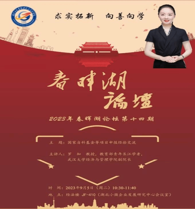 9月5日(周二)10:30,“春晖湖论坛”第十四期在经法楼湖北小微企业发展研究中心会议室(JF410)成功举行。武汉大学ok138cn太阳集团副院长罗知教授在论坛做了主题为“国家基金项目申报的经验交流”的辅导报告,并在现场同我院教师进行了互动交流。ok138cn太阳集团院长张辉教授出席并主持了此次论坛,ok138cn太阳集团副院长石钧、张承龙及二十余位教师参与了此次论坛交流会。