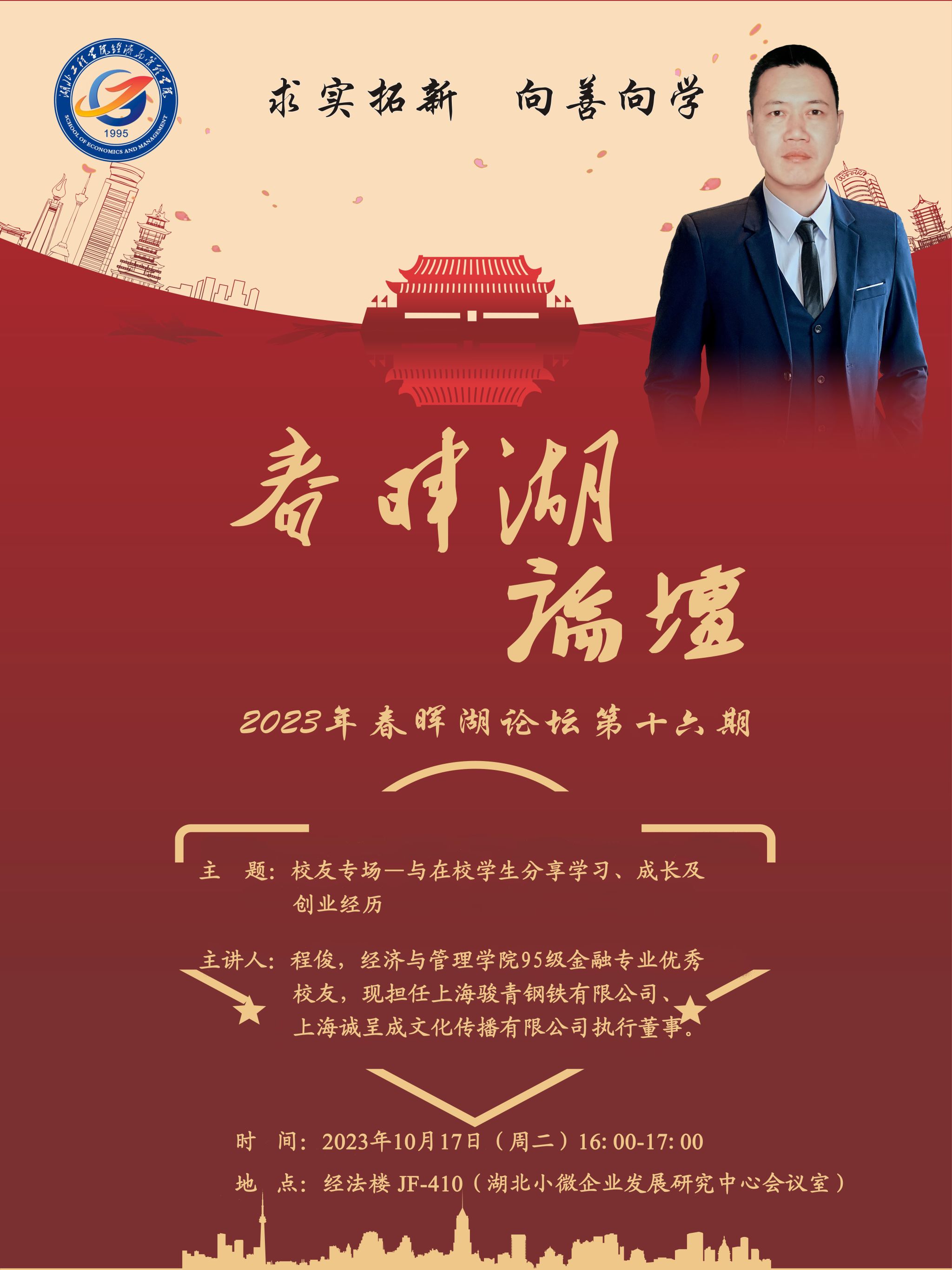 10月17日(周二)下午,为喜迎80 周年校庆,“春晖湖论坛”第十六期暨校友专场讲座在经法楼湖北小微企业发展研究中心会议室成功举行。经管学院95级金融专业优秀校友程俊与2024级市场营销专业全体新生一起分享了学习、成长及创业经历。活动由经管学院副院长石钧主持。