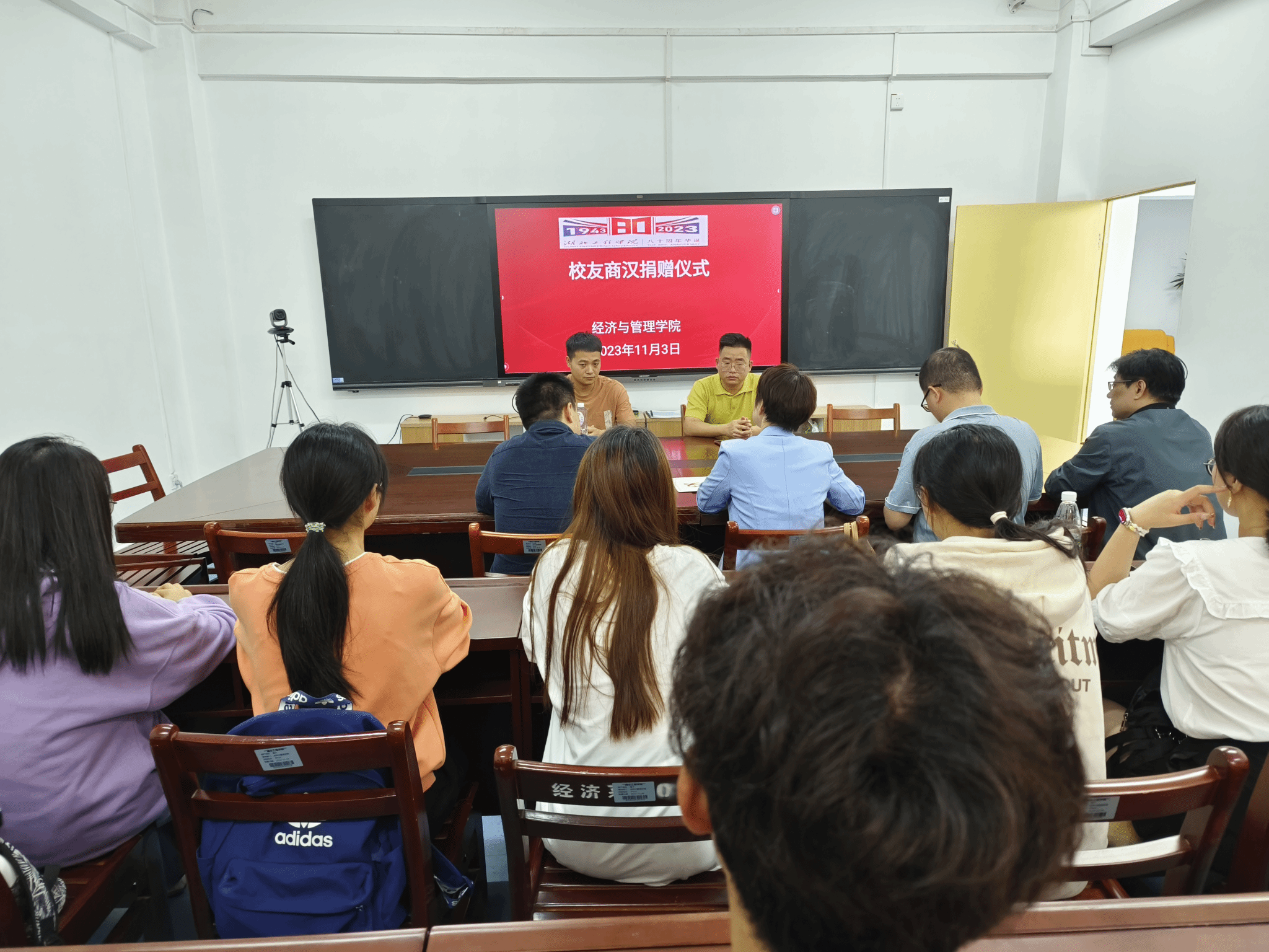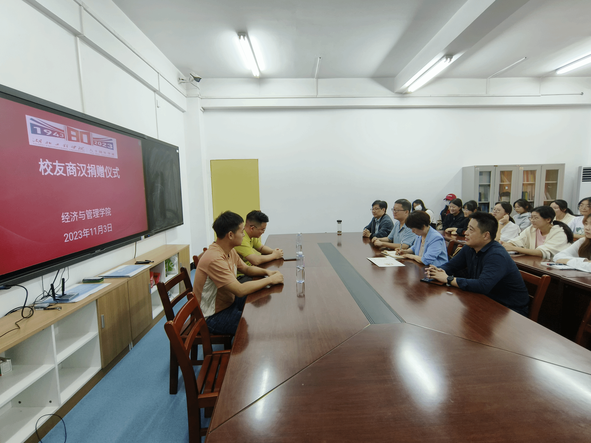 11月3日,我院16届经济学校友商汉向学院捐赠了一批物资,祝贺母校八十周年校庆,表达对母校的恩情。捐赠仪式在经法楼410会议室举行,学院领导班子、班主任、教师代表和学生代表参加,仪式由学院党委书记刘莉萍主持。