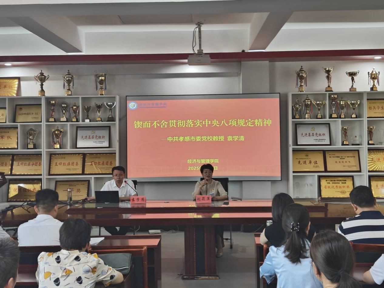 为夯实全面从严治党根基,推动作风建设走深走实,65日,经管学院联合化材学院举办“锲而不舍贯彻落实中央八项规定精神学习教育”专题党建活动。活动特邀中共孝感市委党校袁学清教授作报告,两院全体教师党员及经管学院学生党员共同参与学习。