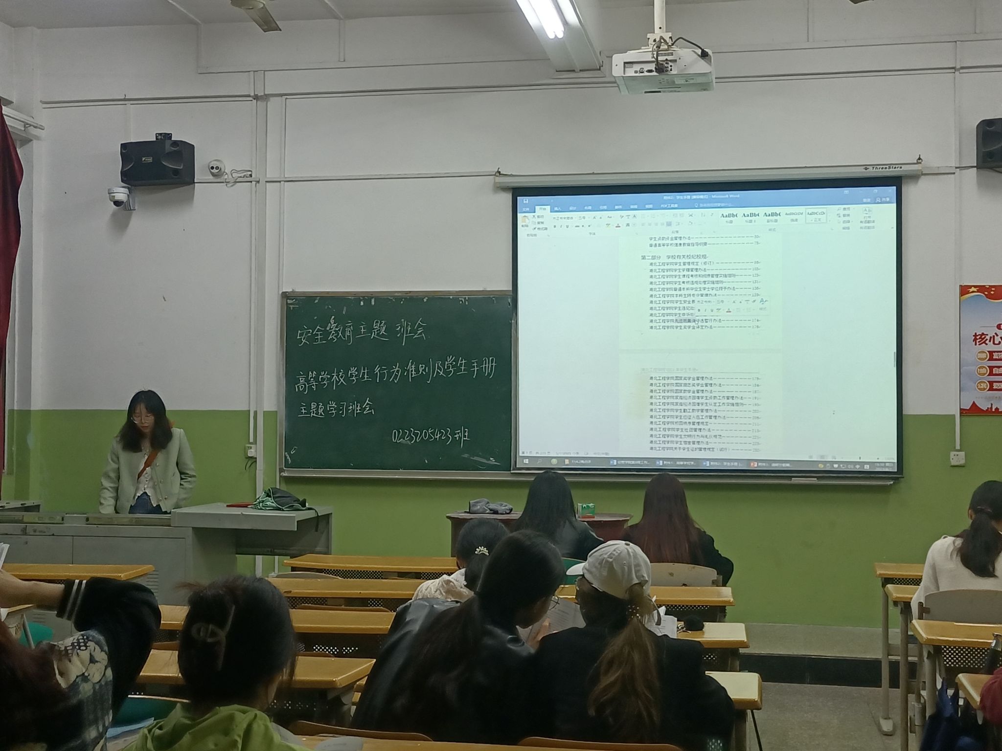 班会上,各班主任为学生讲解了《高等学校学生行为准则》和《学生手册》中的宿舍管理办法、考核违规处理实施细则、学生违纪处分办法等内容,并嘱咐学生牢记学校的校训、校风、学风。校规校纪,不仅约束着学生的言行,还引导着学生思想的正确发展。班主任结合学校、学院真实事例,为学生讲解学生违纪处理、安全管理制度等内容。此次班会让同学们深刻认识了学校的规章制度,强化班级同学们的思想觉悟,力求学有所思、学有所悟、学有所得。学生纷纷表示,在校期间要规范个人行为准则,不做违规违纪的事,遵守校园纪律,争做新时代有所作为的青年大学生。