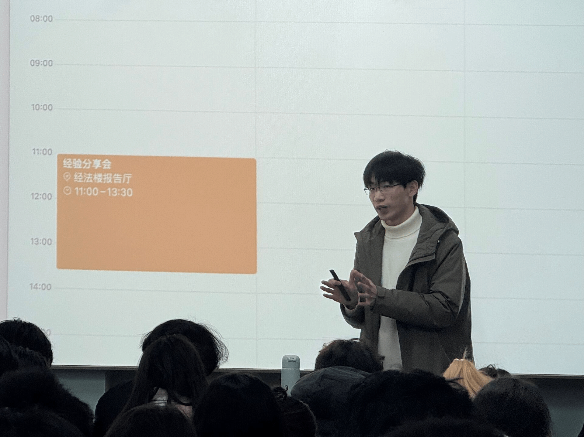 国家励志奖学金和校级特等奖学金获得者龚诚同学同样也在24级经济学专业班级进行了学习经验分享,他从职业选择、办公技巧和时间管理等方面分享自己的心得。其中,他着重介绍了自己独特的时间管理工具——日历。他表示用日历科学管理时间可以有效地帮助我们防止遗漏,培养我们意志力,合理安排作息等,从而提高我们做任何事情的效率。