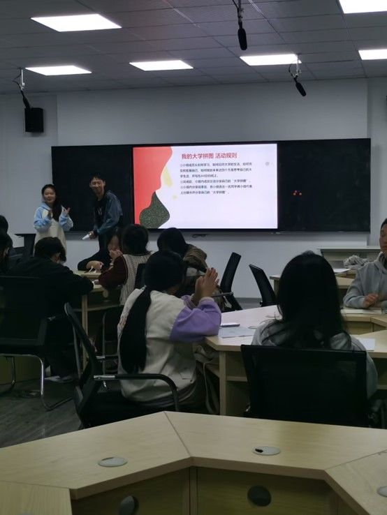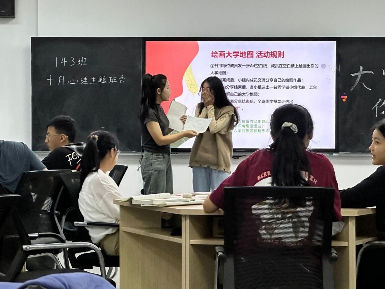 “你好,大学”心理班会以破冰游戏开场,热情洋溢的气氛中,学生们共同绘制出心中的“大学地图”。通过小组讨论与分享,他们明晰了学习目标与生活规划。接连的“烦恼树洞”活动及趣味拼图游戏等形式,引导学生从学习、生活、个人发展、未来规划四大方面深入思考,寻找自己的位置与方向。最后,心理委员们向同学们传递了恰当的大学生活应对策略,如:良好的生活习惯和恰当的人际交往方法。