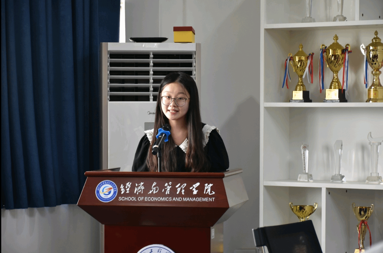 随后,两位获奖学生代表依次上台发言,他们首先对给予此次奖学金荣誉的校友表达了诚挚的感谢。21级经济学专业万宏江同学分享了参加学科竞赛的经验,他强调了团队合作的重要性,指出团队需凝聚成合力朝共同目标努力;22级经济学专业黎雨悦同学分享了学习经验,她表示学习要提高效率、提升课堂专注力,养成良好的学习习惯,积极参加活动以提升专业水平与综合素质。