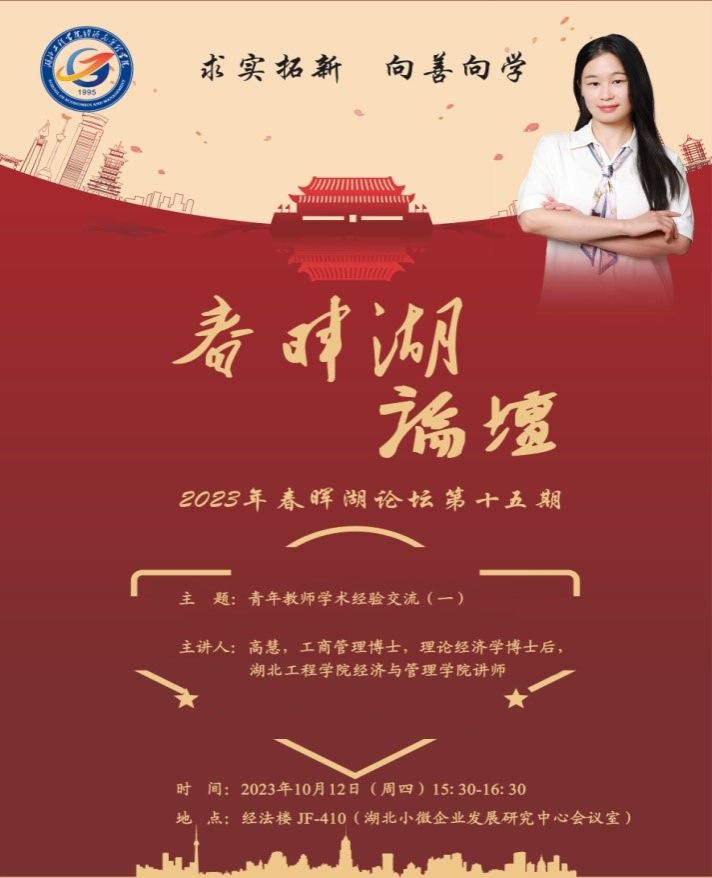 1012日(周四)下午,“春晖湖论坛”第十五期在经法楼湖北小微企业发展研究中心会议室成功举行。经管学院2023年新引进教师高慧博士给大家带来了一场题为《知识与创新管理》的学术交流活动,二十多位院内老师参加了本次论坛。