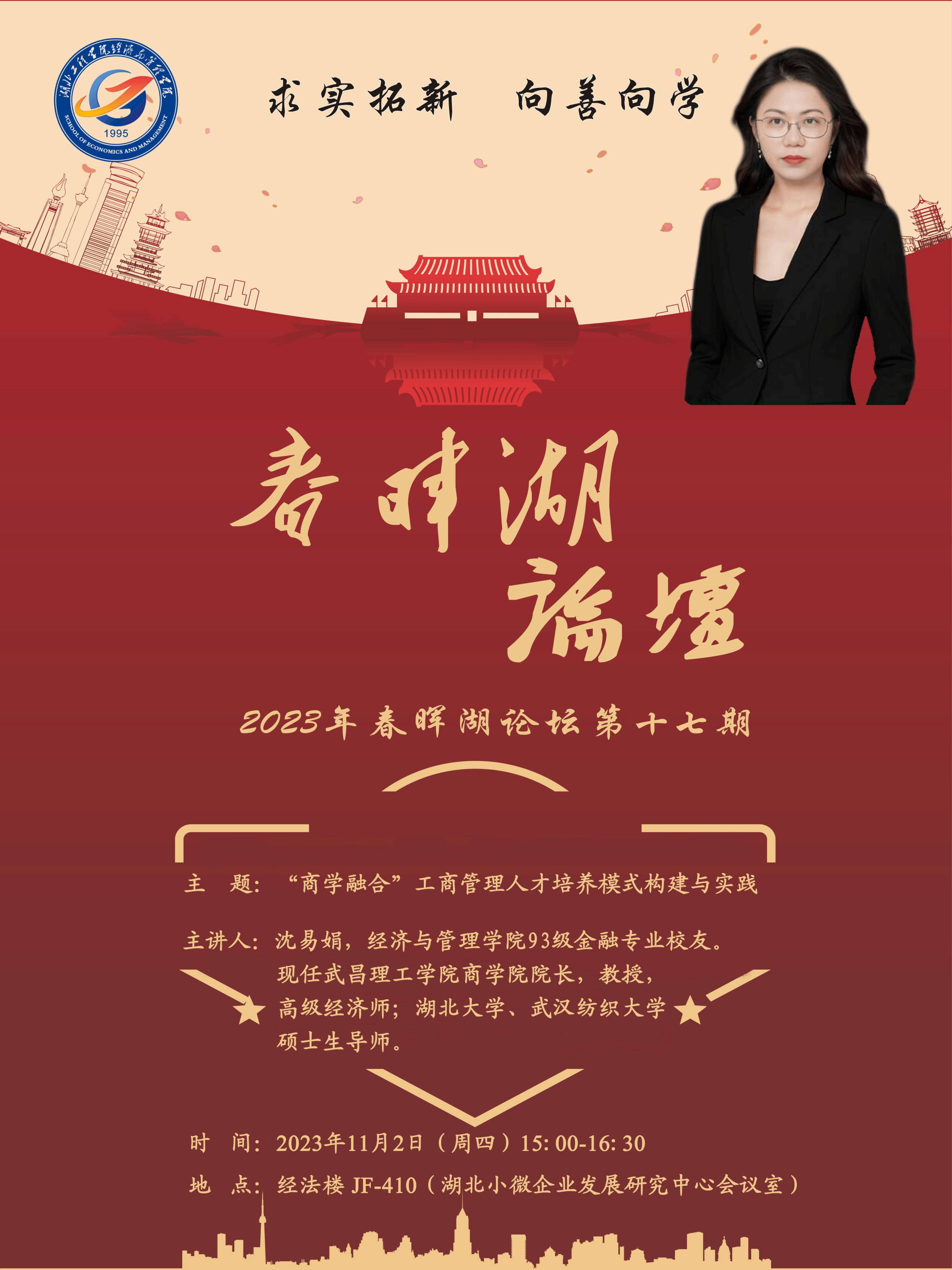 11月2日(周四)下午,“春晖湖论坛”第十七期在经法楼湖北小微企业发展研究中心会议室成功举行。经管学院93级贸易经济专业校友,现任武昌理工学院商学院院长沈易娟教授及其教学团队为大家带来了一场题为《“商学融合”工商管理人才培养模式构建与实践》的专业课程建设与人才培养学术交流活动。经管学院全体班子成员,教学团队负责人及骨干教师参加了本次论坛。讲座中,沈易娟教授首先声情并茂地回忆了自己在校求学期间的点点滴滴以及职业生涯发展的几个重要阶段,...