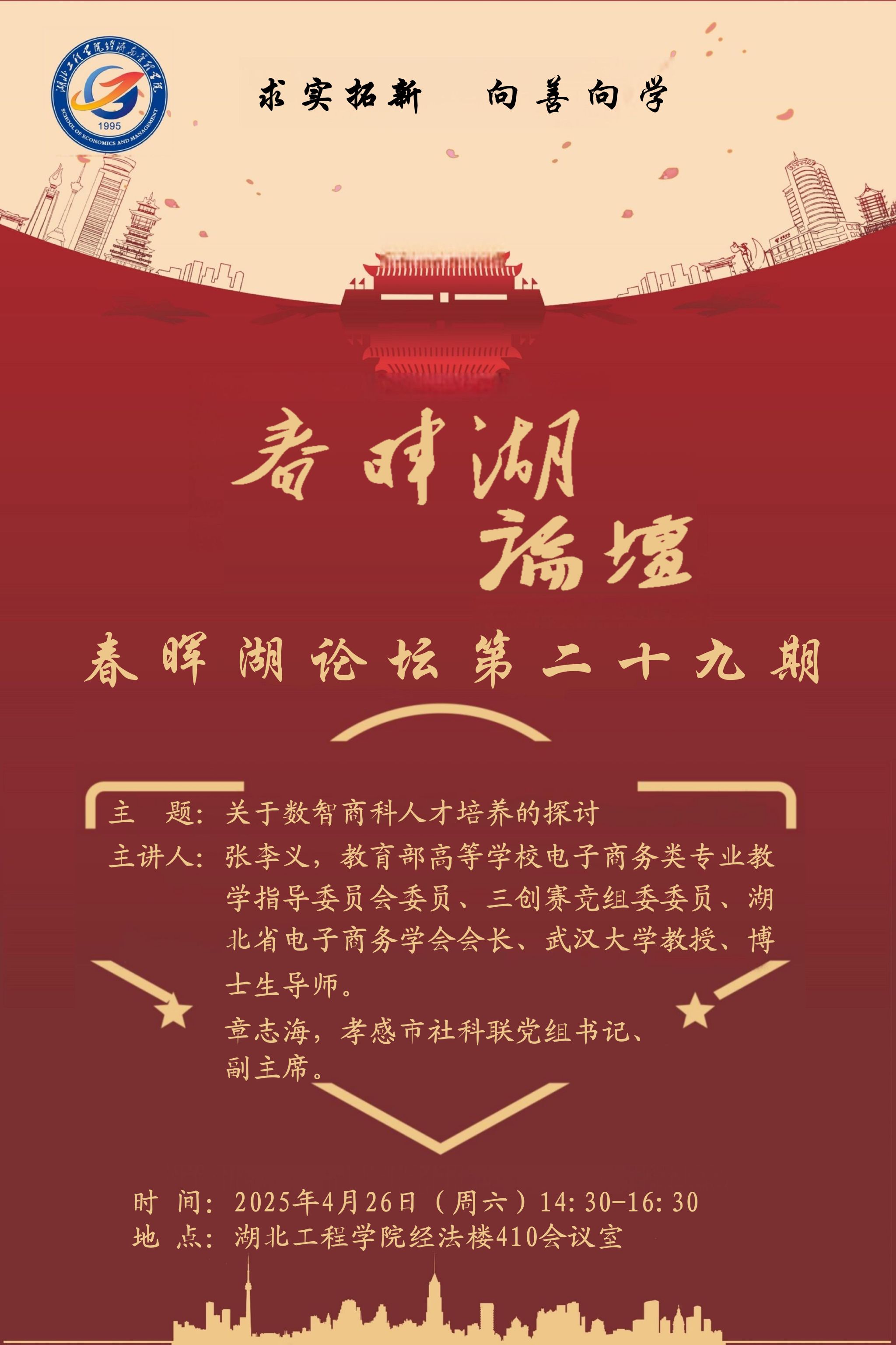4月26日下午,ok138cn太阳集团第二十九期“春晖湖论坛”在经法楼410会议室顺利举行。本期论坛以“数智商科人才培养的探讨”为主题,邀请了教育部高等学校电子商务类专业教学指导委员会委员、湖北省电子商务学会会长、武汉大学教授、博士生导师张李义,孝感市社科联党组书记、副主席章志海,OK138太阳集团新技术学院院长张辉教授担任主讲嘉宾。ok138cn太阳集团院长黄宏磊教授现场主持,学院教师代表共同参与了本次论坛。论坛围绕ok138cn太阳集团拟新增的数字经济专业、...